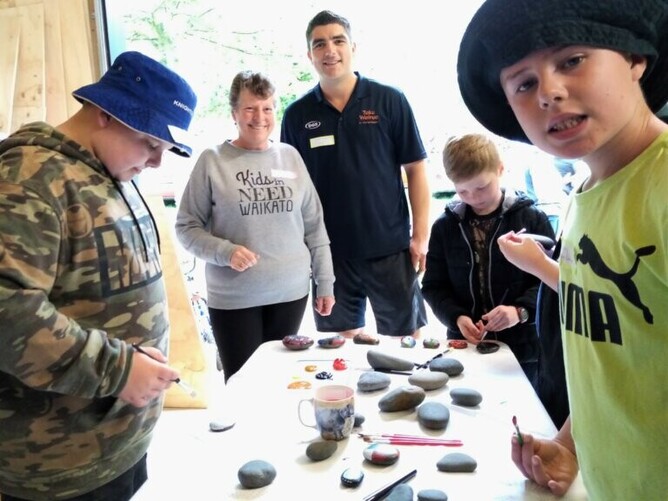 Linda Roil said she was delighted to have the group on board to help brighten Christmas for less-fortunate children. As well as painting rocks in lively colours and with special messages, and making Christmas Eve bags, the group did a spot of yard work around the Kids in Need Waikato shed.