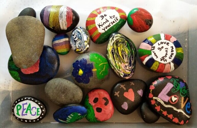 Some of the before and after painted rocks bearing upbeat Christmas messages for Kids in Need Waikato gift bags
