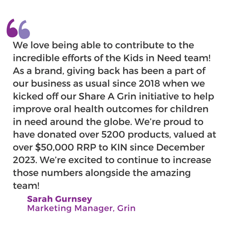 In January 2024, we received 1,550 eco-friendly toothbrushes for the tamariki we support from Grin Natural and Chemist Warehouse New Zealand Cambridge. This generous donation was a game-changer, freeing up funds to purchase other items for our care packs. Since then, Grin has continued to support us with toothbrushes, kits, and more helping us ensure every family has access to the basics they deserve. We are so grateful for their support and commitment to Kids in Need.